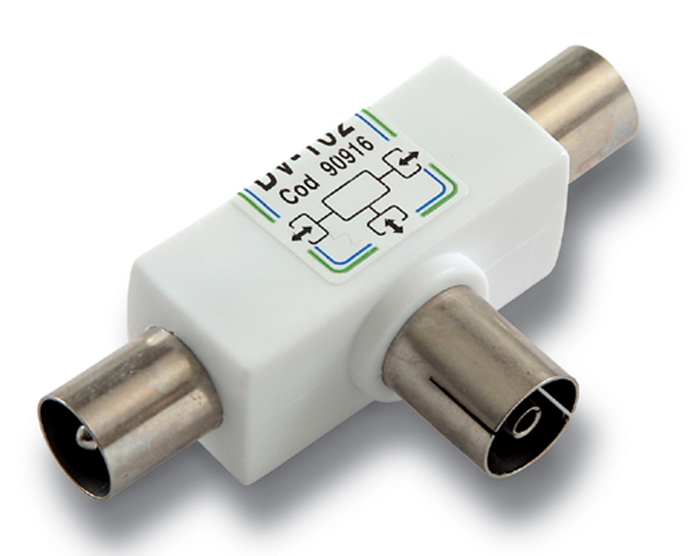 Dva výstupní rozbočovače na výstupu videa, DVD nebo satelitního přijímače. Lze použít jako multipřepínač o dvou vstupech. IEC konektor samice na vstupu a IEC samec na výstupu.