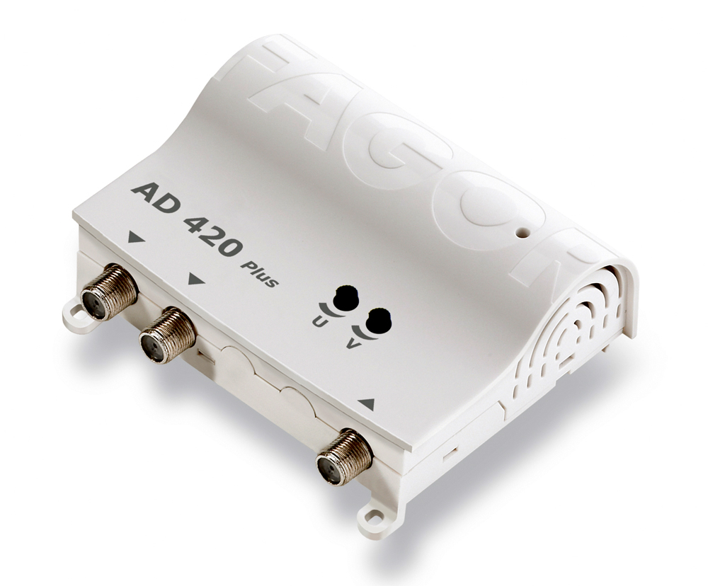 Zesilovač AD 420 Plus je domovní zesilovač pro pozemní analogový a digitální příjem TV/FM signálů. Má jeden vstup VHF/UHF a dva výstupy. Zesílení je regulovatelné. Je vhodný pro použití v rodinných domech i pro více bytových jednotek.