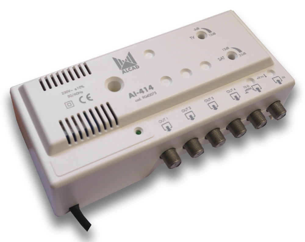 Zesilovač AI-414 je domovní zesilovač pro pozemní analogový/digitální příjem TV/FM signálů a satelitní mezifrekvence. Má 1 vstup (TV/SAT) a čtyři výstupy a je průchozí pro napájení LNB. Je vhodný pro použití v rodinných domech i pro více bytových jednotek. Zesilovač je vyroben v ZAMAC odlitku který má vynikající stínící účinky a je kryt plastovým obalem. Zesílení je regulovatelné zvlášť v TV a SAT pásmu.