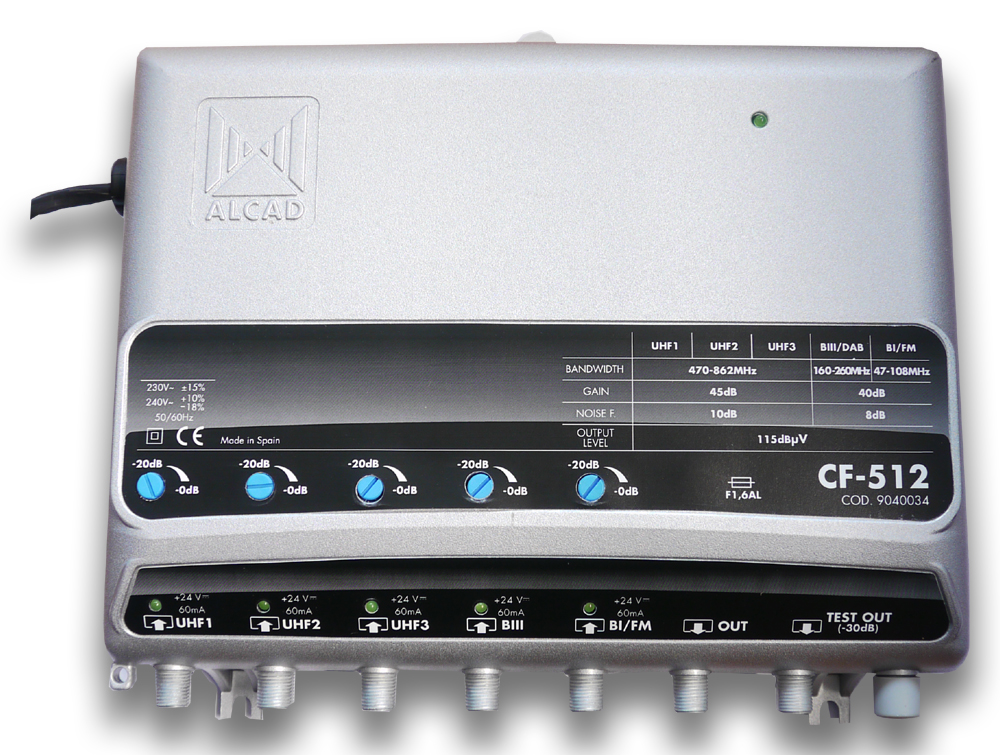 Zesilovač CF-512 je výkonný domovní zesilovač pro pozemní analogový a digitální příjem TV/FM signálů. Je vhodný pro použití v rodinných domech i pro více bytových jednotek nebo v malých STA. Zesilovač je vyroben v ZAMAC odlitku, který má vynikající stínící účinky. Vstupy jsou řešeny pásmově s automatickým napájení předzesilovačů, v případě zkratu dochází k automatickému elektronickému přerušení napájení.+24V. Zesílení všech vstupů je regulovatelné. Zesilovač má testovací výstup (-30 dB) pro nastavování zapojeného zesilovače.