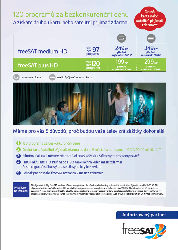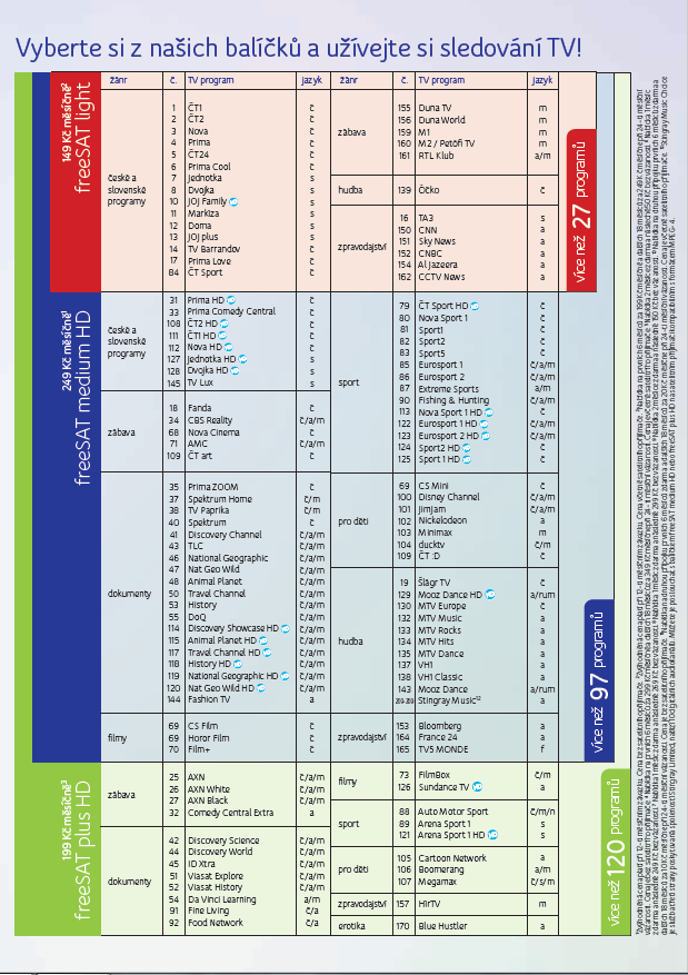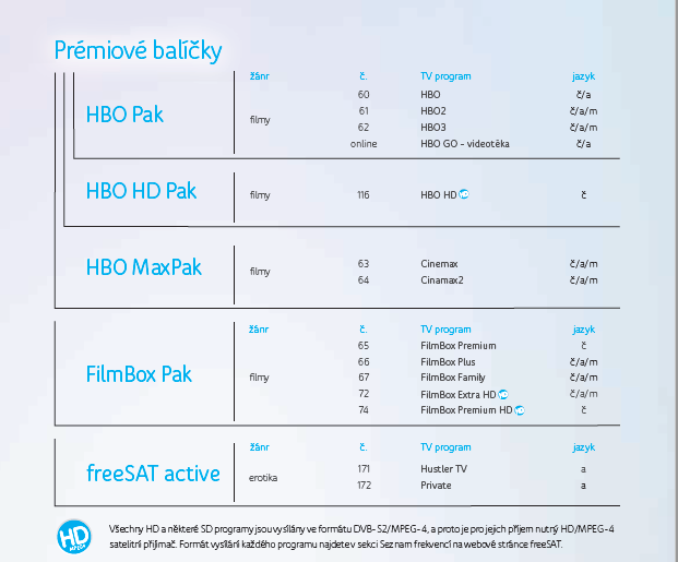 Momentálně freeSAT nabízí balíček plus HD karta od 199,-Kč měsíčně obsahující 120 programů