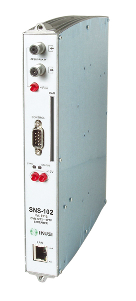 IP streamery představují základ technického řešení distribuce TV programů v IP sítích. Princip jejich činnosti je následující: vstupní digitální signál DVB-T nebo DVB-S/S2 je přiveden do streameru, ve kterém je až 8 programů z jednoho multiplexu převedeno na IP stream (multicast) s vlastní IP adresou pro každý program. IP stream je potom přes ethernet switch připojen do IP sítě. Celkový počet programů je omezen pouze propustností sítě. Příjem TV programů je potom realizován buď pomocí IPTV set-top-boxu a nebo přes připojený počítač.----------------------------------------------------------------------------- SNS-102 je určen pro převod až 8 kódovaných nebo nekódovaných (dle typu CAM modulu) TV nebo R programů z DVB-S/S2 do IP. TV programy mají svoji individuální multicast adresu a mohou být distribuovány kódované nebo dekódované. Počet streamerů na hlavní stanici je dán počtem transpondérů na kterých jsou umístěné požadované programy. SNS-102 mají satelitní vstup/výstup (ve smyčce) ke které jednoduše umožňuje připojit IF SAT signál z LNB. Vstupy lze rovněž připojit přes multipřepínač což následně umožňuje kdykoli jednoduchou změnu SAT IF bez nutnosti změny kabeláže. Nastavování streameru se provádí přes webové rozhraní.