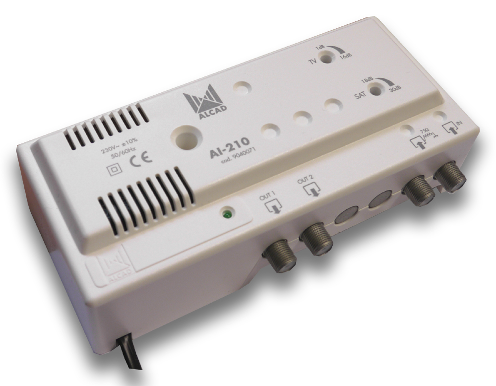 Zesilovač AI-210 je domovní zesilovač pro pozemní analogový/digitální příjem TV/FM signálů a satelitní mezifrekvence. Má 1 vstup (TV/SAT) a dva výstupy. Je vhodný pro použití v rodinných domech i pro více bytových jednotek. Zesilovač je vyroben v ZAMAC odlitku který má vynikající stínící účinky a je kryt plastovým obalem. Zesílení je regulovatelné v zvlášť v TV a SAT pásmu.