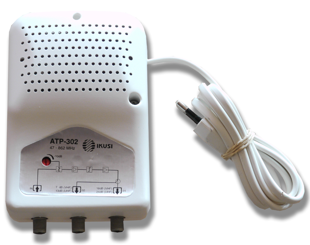 Zesilovač ATP-302 je bytový zesilovač pro pozemní analogový a digitální příjem TV/FM signálů. Má jeden vstup VHF/UHF a dva nesymetrické výstupy. Zabudován je fixní náklon 6 dB. Zesílení je regulovatelné. Je vhodný pro použití v bytech a rodinných domech. Zesilovač je vyroben v ZAMAC odlitku který má vynikající stínící účinky a je kryt plastovým obalem. Je určen výhradně pro vnitřní prostředí.