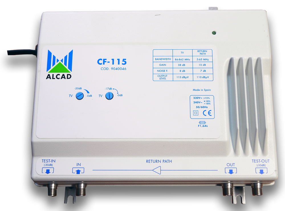 Zesilovač CF-115 je výkonný linkový zesilovač pro zesílení multiplexu pozemních analogových a digitálních TV/FM kanálů. Je vhodný pro distribuci signálu v STA nebo malých kabelových rozvodech. Zesilovač je vyroben v ZAMAC odlitku, který má vynikající stínící účinky. Zesilovač má zesílení 38 dB s regulací 20 dB a regulací náklonu 18 dB. Zesilovač má testovací vstup a výstup (-30 dB) pro nastavování zapojeného zesilovače. Součástí zesilovače je aktivní zpětný kanál 5-65 MHz.
