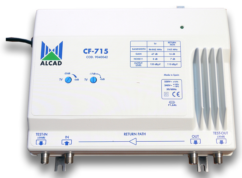 Zesilovač CF-715 je výkonný linkový zesilovač pro zesílení multiplexu pozemních analogových a digitálních TV/FM kanálů. Je vhodný pro distribuci signálu v STA nebo malých kabelových rozvodech. Zesilovač je vyroben v ZAMAC odlitku, který má vynikající stínící účinky. Zesilovač má zesílení 38 dB s regulací 20 dB a regulací náklonu 18 dB. Zesilovač má testovací vstup a výstup (-30 dB) pro nastavování zapojeného zesilovače. Součástí zesilovače je aktivní zpětný kanál 5-65 MHz.