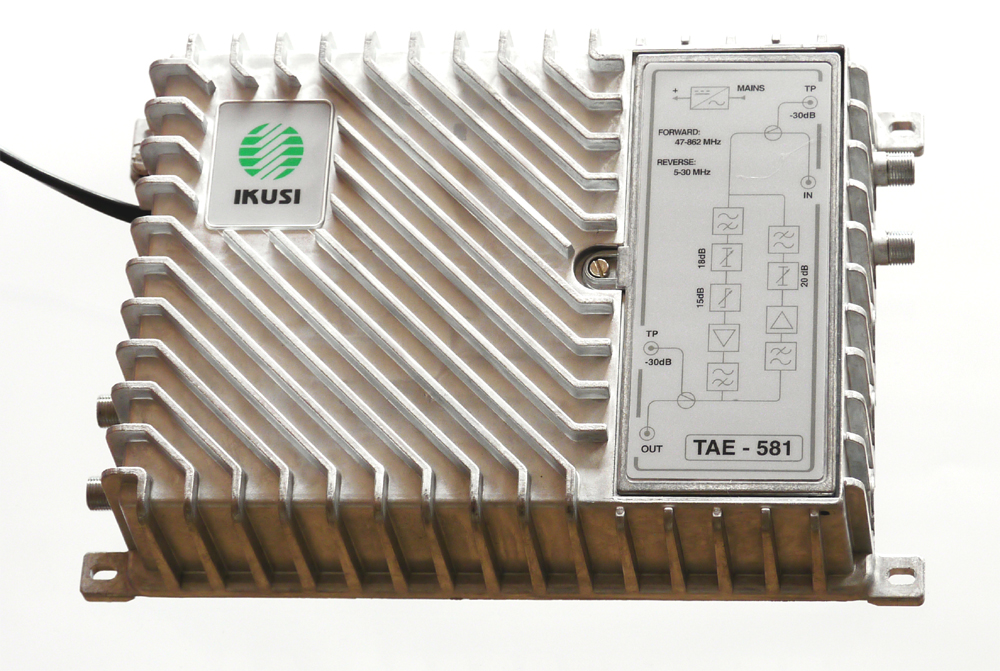 Zesilovač TAE-581 je výkonný linkový zesilovač pro zesílení multiplexu pozemních analogových a digitálních TV/FM kanálů. Zesilovač obsahuje technologii Power Doubling a je vhodný pro distribuci signálu v STA nebo kabelových rozvodech. Zesilovač je vyroben v ZAMAC odlitku, který má vynikající stínící účinky. Zesilovač má zesílení 35 dB s regulací 18 dB a regulací náklonu 18 dB. Zesilovač má testovací vstup a výstup (-30 dB) pro nastavování zapojeného zesilovače. Součástí zesilovače je aktivní zpětný kanál 5-30 MHz.
