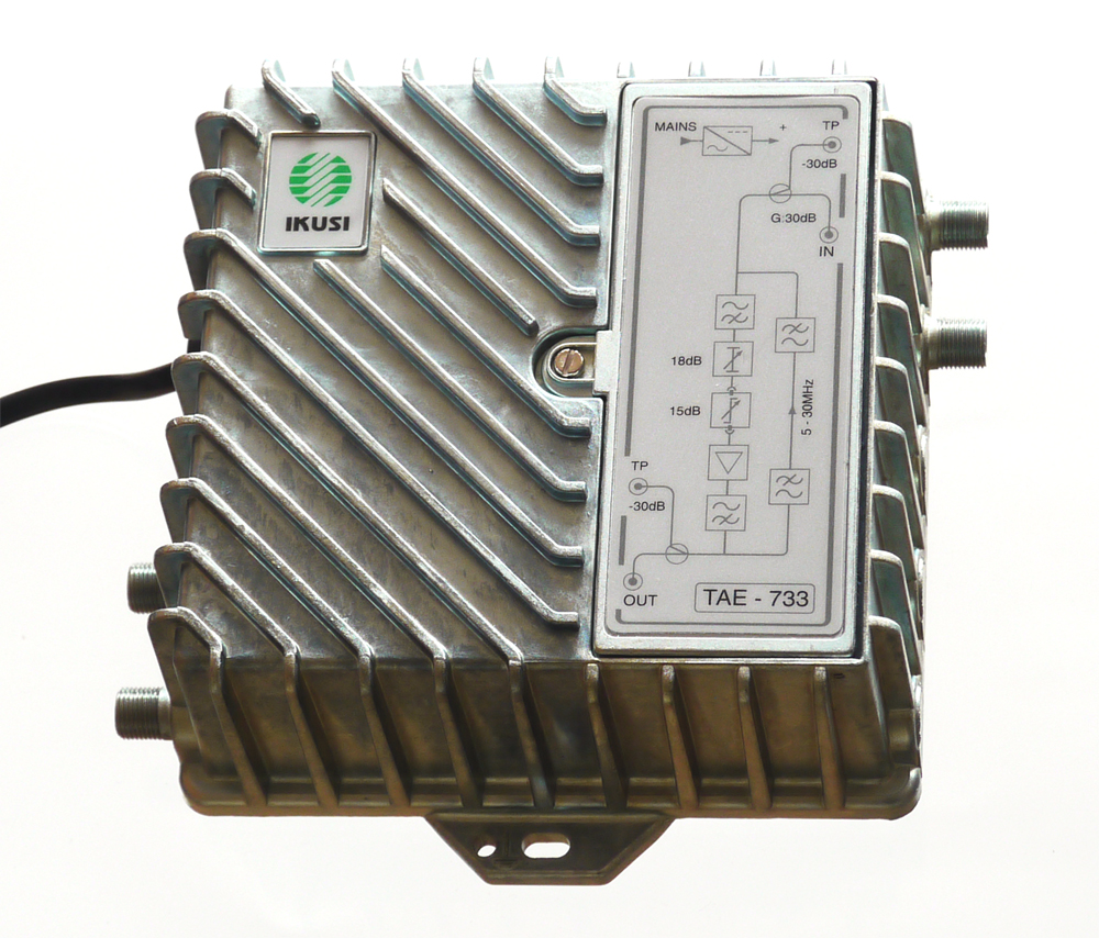 Zesilovač TAE-733 je linkový zesilovač pro zesílení multiplexu pozemních analogových a digitálních TV/FM kanálů. Zesilovač obsahuje technologii Push-Pull a je vhodný pro distribuci signálu v STA nebo malých kabelových rozvodech. Zesilovač je vyroben v ZAMAC odlitku, který má vynikající stínící účinky. Zesilovač má zesílení 29 dB s regulací 18 dB a regulací náklonu 15 dB. Zesilovač má testovací vstup a výstup (-30 dB) pro nastavování zapojeného zesilovače. Součástí zesilovače je pasivní zpětný kanál 5-30 MHz.