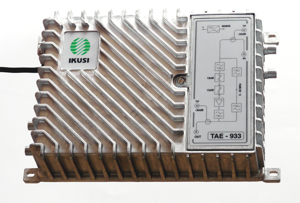 Zesilovač TAE-933 je linkový zesilovač pro zesílení multiplexu pozemních analogových a digitálních TV/FM kanálů. Zesilovač obsahuje technologii Push-Pull a je vhodný pro distribuci signálu v STA nebo malých kabelových rozvodech. Zesilovač je vyroben v ZAMAC odlitku, který má vynikající stínící účinky. Zesilovač má zesílení 36 dB s regulací 18 dB a regulací náklonu 15 dB. Zesilovač má testovací vstup a výstup (-30 dB) pro nastavování zapojeného zesilovače. Součástí zesilovače je pasivní zpětný kanál 5-30 MHz.